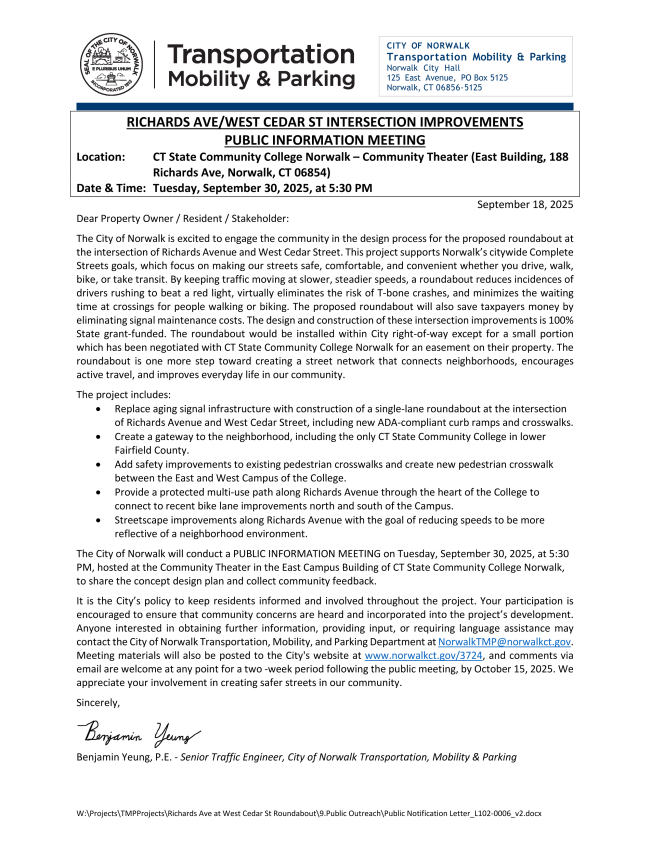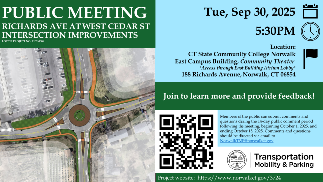| Dear West Norwalk Residents, Tonight is the public meeting regarding the West Cedar St improvements. Please join if you are concerned about the project or have questions and comments. Information below: RICHARDS AVE/WEST CEDAR ST INTERSECTION IMPROVEMENTS PUBLIC INFORMATION MEETING Location: CT State Community College Norwalk – Community Theater (East Building, 188 Richards Ave, Norwalk, CT 06854) Date & Time: Tuesday, September 30, 2025, at 5:30 PM As always, please feel free to reach out to the board with any questions (board@westnorwalk.org). We value your input! We look forward to seeing you all in October, The West Norwalk Association Board of Directors PS: Here’s the link to the City of Norwalk’s page about the project. ![]() |